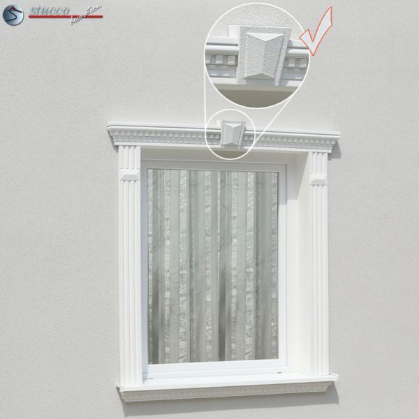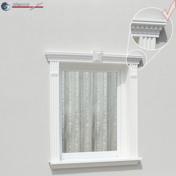 Das beschichtete Fassadenprofil Canberra 107-F brauchen Sie nur noch entsprechend Ihren Fenstermaßen zu kürzen und dann mit PU Schaumkleber über dem Fenster an Ihrer Hausfassade als Fensterverzierung zu befestigen. Mit ein wenig Beschichtungsmasse verwischen Sie professionell die Stöße und schon können Sie den Fassadenstuck mit Ihrem Lieblingsfarbton einer Farbe auf Wasserbasis überstreichen. Fertig ist eine ansprechende Fensterverzierung. Wäre das nichts für Sie?