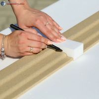 Kleben Sie zuerst die Schließelemente oder Eckelemente mit Soudal PU-Kleber an, dann schneiden Sie die Außenstuck Zierleiste so auf Maß, dass nach dem Ankleben der Leistenstücke zwischen den Schließelementen/Eckelementen und der Profilleiste 5-8 mm breite Stoßfugen entstehen.