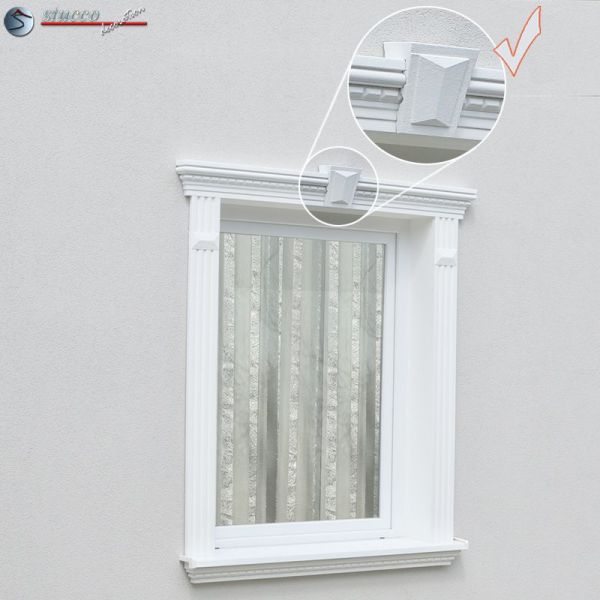 Das Fassadenelement Stuckleiste Damascus 107-K ist ein ausdrucksstarkes Fassadenprofil aus Styropor für den Fenstersturz. Es lässt sich sehr gut mit dem Fensterbankprofil Kairo 106-K kombinieren, da beide Styroporleisten das selbe Walmdachmuster aufweisen. Auch als Umlaufgesims und Gurtgesims kann diese edle Außenstuck Zierleiste eingesetzt werden, denn sie lässt sich hervorragend mit anderen Außenstuck Fassadenelementen kombinieren. Die Schließelemente, das Eckelement und der Schlussstein sind in Größe und Stuckmuster auf das unbeschichtete Fassadenprofil abgestimmt.