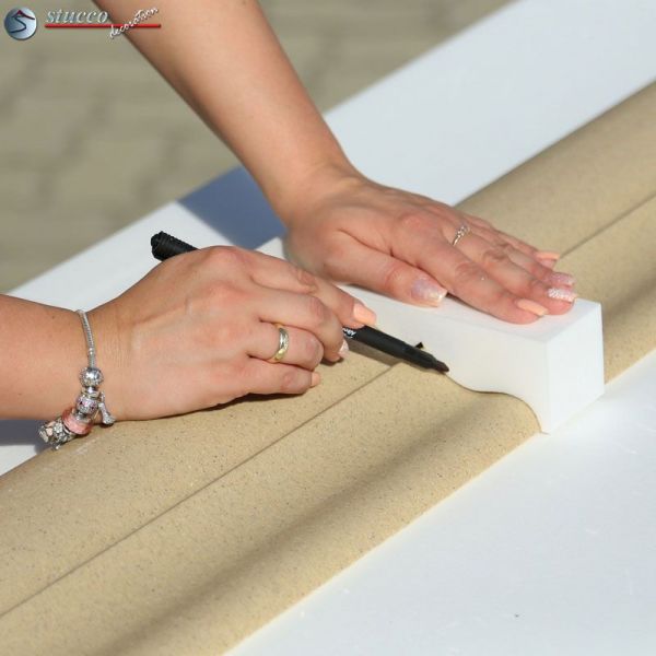 Die Fassadenprofile aus Styropor, die sich zur Verzierung bestehender Sohlbänke eignen, können schnell und einfach eingebaut werden. Die einbaufertigen linken und rechten Schließelemente sind in Größe und Stuckmuster mit der gleichnamigen Zierleiste identisch und erleichtern die Stuckarbeiten. Sehen Sie sich bitte unser Video an, in dem wir zeigen, wie Sie Ihre bestehende Stein- oder Kunststoffsohlbank mit stoßfesten Zierleisten verzieren können.