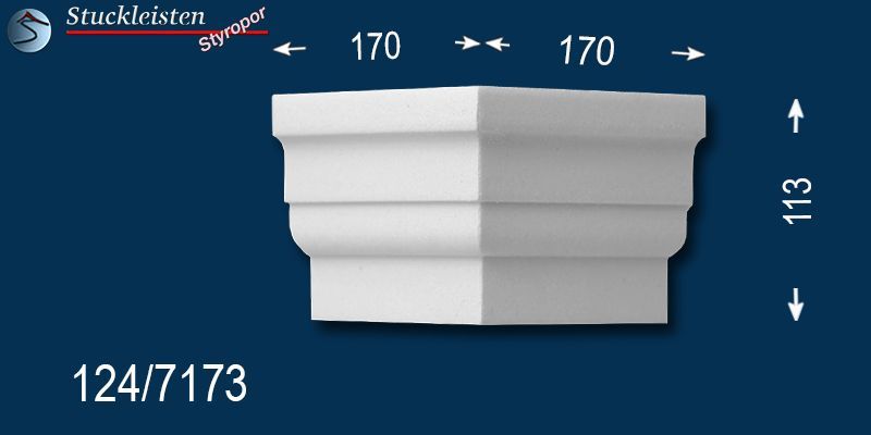 Sowohl auf dieser bemaßten Querschnittszeichnung als auch auf den nachfolgenden Produktbildern mit dem blauen Hintergrund finden Sie die Maße des beschichteten Fensterbankprofils Nürnberg 124 und seiner Ergänzungselemente. Prüfen Sie bitte vor dem Bestellen, ob genügend Platz zum Anbringen der Stuckelemente zur Verfügung steht. Diese Fassadenstuckleiste lässt sich aufgrund des zeitlosen, schlichten Musters sehr gut mit anderen Fassadenelementen und Stuckmustern kombinieren. Kontrollieren Sie anhand der Maße auch, ob die verschiedenen, ausgewählten Zierleisten in der Stärke/Tiefe zueinander passen, damit die Übergänge von Stuckmuster zu Stuckmuster stimmen.