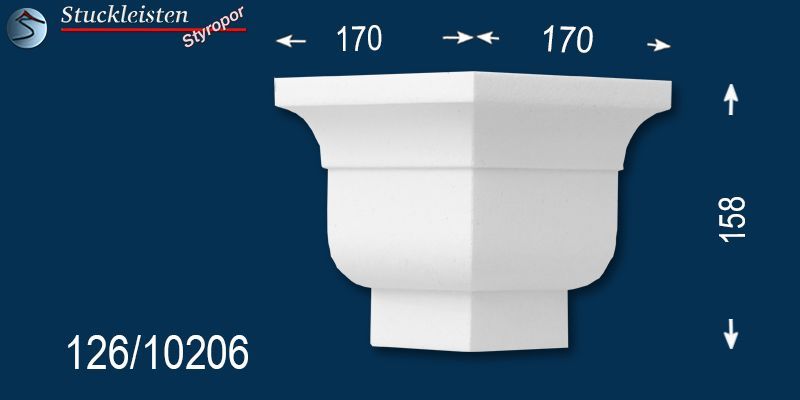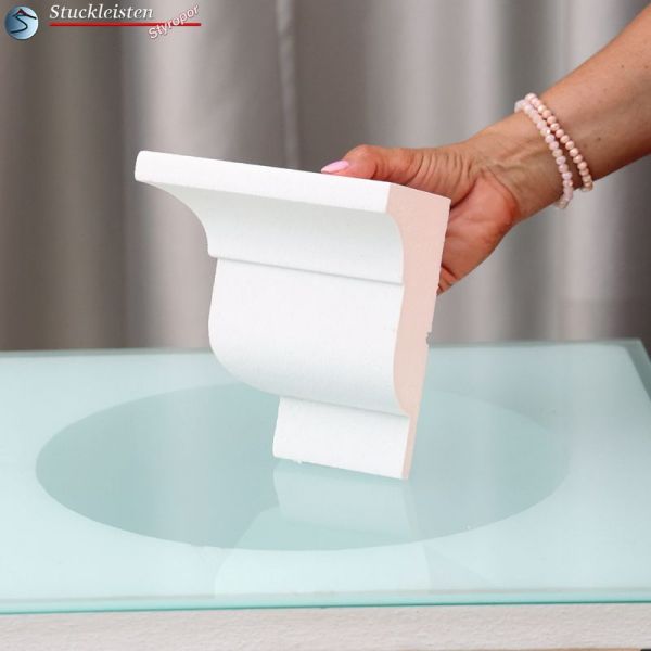 Das wetterfest beschichtete Traufgesims Dachgesims Bonn 126 ist ein schlicht gehaltenes Fassadenprofil aus Styropor (EPS), welches sich dank der stoßfesten Beschichtung für die Verzierung des Übergangs von der Hauswand zum Dach eignet. Das Gesimsprofil Bonn 126 ist 158 mm hoch und 88 mm stark. Mit Hilfe der Gesimsleiste Bonn 126 und den dazu passenden vorgefertigten Ergänzungsementen können stilvolle Traufgesimse, Dachgesimse und Umlaufgesimse einfach realisiert werden. Die Fassadenprofile können nach Abschluss der Stuckarbeiten mit einer umweltfreundlichen Fassadenfarbe auf Wasserbasis (sogenannter Dispersionsfarbe) gestrichen werden. Das beschichtete Traufgesims Bonn 126 ist der kleinere Bruder zu dem beschichteten Dachgesimsprofil Köln 125.