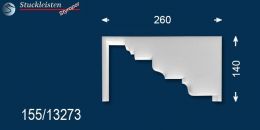 Sowohl auf der Querschnittszeichnung als auch auf den Produktbildern mit dem blauen Hintergrund finden Sie die Maße des beschichteten Dachgesimsprofils Kassel 155 und seiner Ergänzungselemente. Prüfen Sie bitte vor dem Bestellen, ob genügend Platz zum Anbringen der Stuckelemente zur Verfügung steht. Diese Fassadenstuckleiste lässt sich aufgrund des zeitlosen, schlichten Musters sehr gut mit anderen Fassadenelementen und Stuckmustern kombinieren. Kontrollieren Sie anhand der Maße auch, ob die verschiedenen, ausgewählten Zierleisten in der Stärke/Tiefe zueinander passen.
