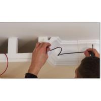 Erst einmal muss der Transformator mit Netzstrom versorgt werden, damit er die ca. 230 V Wechselstrom in 12 V Gleichstrom für die LED Lichtbänder heruntertransformieren kann. Das bedeutet, dass für den Trafo ein Stromkabel verlegt werden muss. Wie können Sie das Kabel zur Stromversorgung des Trafos einfach, sauber und unsichtbar verlegen? Mit unseren Stuckleisten für indirekte Beleuchtung, denn diese durchdachten Lichtprofile verfügen auf der Rückseite über eine spezielle Aussparung. Alles was Sie tun müssen, ist, das Stromkabel in der Schnittlinie zwischen Wand und Decke zu befestigen und dann die Styroporleiste für indirekte Beleuchtung darüber zu kleben. Zum Fixieren des Stromkabels eignet sich eine Heißklebepistole oder kleine, selbstklebende Kabelhalter.