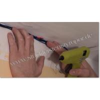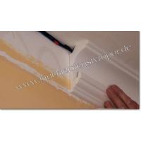Im Montage-Video sehen Sie, dass zur Fixierung der Stuckleisten neben dem Systemkleber auch eine Heißklebepistole verwendet wird. Tragen Sie zuerst den Systemkleber auf – wellenförmig auf breite Klebeflächen und strangweise auf schmale Klebeflächen. Danach verteilen Sie auf die Klebeflächen punktweise etwas Heißkleber mit einer handelsüblichen Heißklebepistole. Auf diese Weise müssen die angeklebten Stuckprofile nicht abgestützt werden, bis der Systemkleber nach ca. 24 Stunden seine volle Haftkraft erreicht hat. Der Heißkleber haftet sofort, der Styroporkleber sorgt langfristig für guten Halt und elastische Fugen, die nicht reißen. Mit diesem kleinen Klebe-Trick erledigen Sie die Stuckarbeiten wesentlich schneller und einfacher. Gewusst wie, spart eben nicht nur Energie, sondern auch Zeit, Aufwand und Nerven.