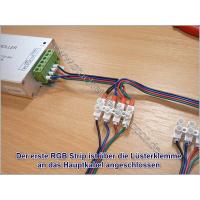 Weil es so immens wichtig ist, betonen wir es an dieser Stelle noch einmal: LED Streifen, deren Gesamtlänge 5 m übersteigen, müssen mit Parallelschaltung angeschlossen werden! Auf den folgenden Bildern demonstrieren wir Ihnen, wie RGB LED Strips angeschlossen werden sollen. Sicher wird Ihnen auffallen, dass wir die Lichtbänder nur an einer Seite angeschlossen haben und das Kabel für die Parallelschaltung sehr kurz gehalten ist. Der Grund dafür ist einfach: Nur so können wir auf den Fotos alles gut sichtbar für Sie darstellen.