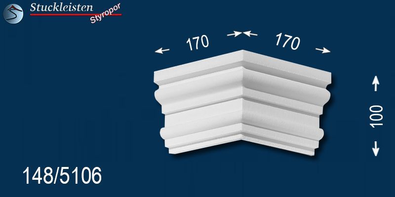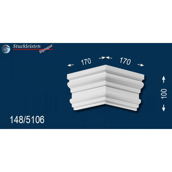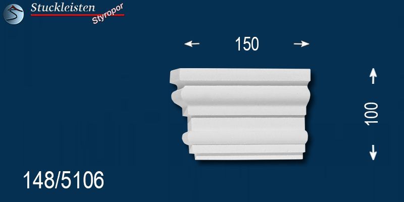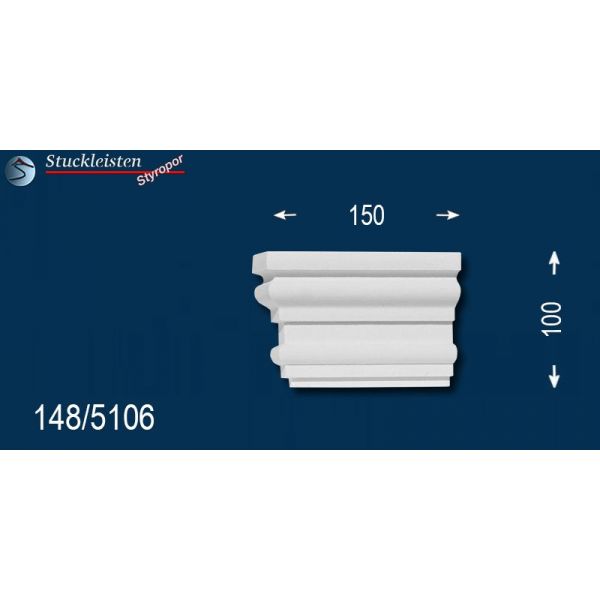 Auf dem Produktbild mit dem blauen Hintergrund finden Sie die Maße der beschichteten Dachgesims Zierleiste Magdeburg 148. Prüfen Sie bitte vor dem Bestellen, ob genügend Platz zum Anbringen der Stuckelemente zur Verfügung steht. Diese Fassadenstuckleiste lässt sich aufgrund des zeitlosen, schlichten Musters sehr gut mit anderen Fassadenelementen und Stuckmustern kombinieren. Kontrollieren Sie anhand der Maße auch, ob die verschiedenen, ausgewählten Zierleisten in der Stärke/Tiefe zueinander passen.