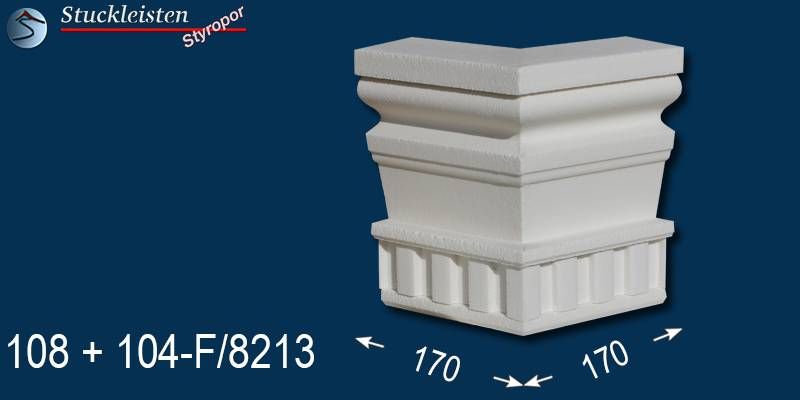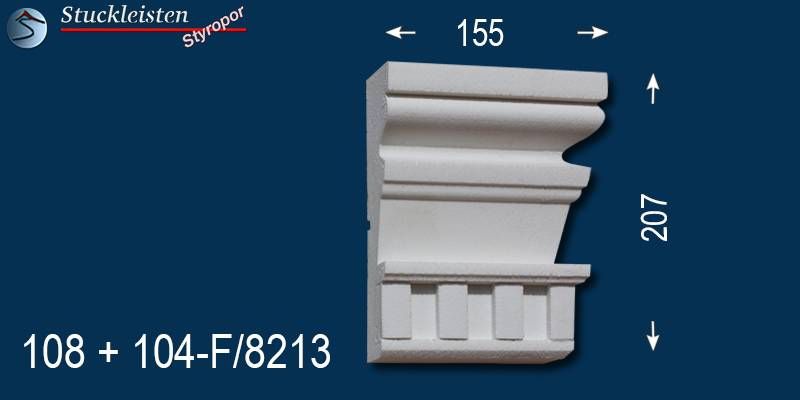 Sowohl auf dieser bemaßten Querschnittszeichnung als auch auf den nachfolgenden Produktbildern mit dem blauen Hintergrund finden Sie die Maße des beschichteten Fassadenprofils Mainz 108+104F/8213 und seiner Ergänzungselemente. Prüfen Sie bitte vor dem Bestellen, ob genügend Platz zum Anbringen der Stuckelemente zur Verfügung steht. Diese Fassadenstuckleiste lässt sich aufgrund des zeitlosen, schlichten Musters sehr gut mit anderen Fassadenelementen und Stuckmustern kombinieren. Kontrollieren Sie anhand der Maße auch, ob die verschiedenen, ausgewählten Zierleisten in der Stärke/Tiefe zueinander passen, damit die Übergänge von Stuckmuster zu Stuckmuster stimmen.