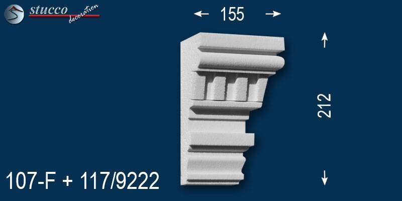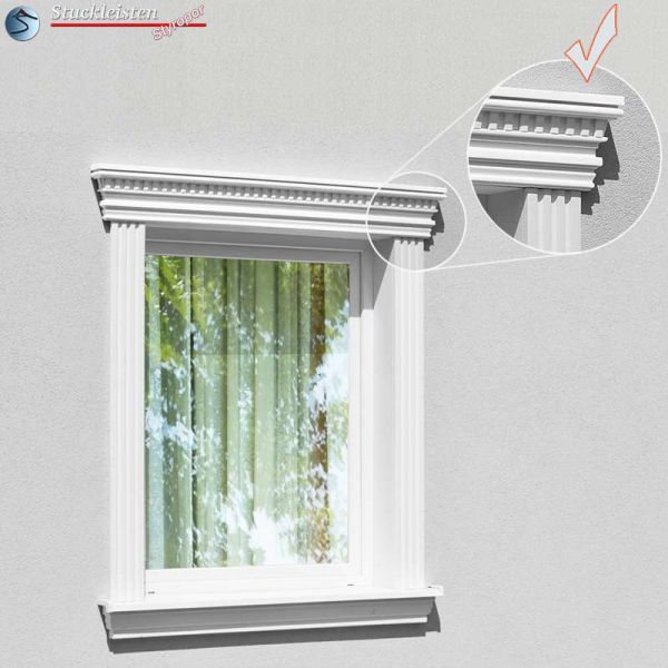 Zierleiste für Fenstersturz: Stoßfestes Gesimsprofil aus Styropor Frankfurt 107-F+117-9222 zu dem Sie auf der Produktseite auch das passende rechte und linke Schließelement finden.
