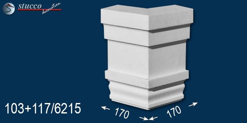 Ein weiteres Ergänzungselement ist das äußere Eckelement. Mit dem äußeren Eckelement lässt sich die Fassadenstuck Zierleiste Hamburg 103+117/6215 als Umlaufgesims verwenden. Diese 90-Grad-Außenecken kleben Sie an den Hausecken an. Wenn alle Eckelemente angebracht sind, dann brauchen Sie nur noch die entsprechend langen Zierleisten dazwischen zu kleben und schon können Sie Ihren Erfolg bewundern.