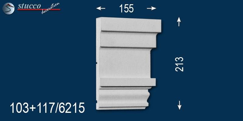 Das Gesimsprofil Hamburg 103+117/6215 ist ein modern gestaltetes Fassadenprofil aus Styropor (EPS), welches sich dank der stoßfesten Beschichtung für die Fensterverzierung und für Gurtgesimse an der Außenfassade eignet. Das Außenstuck Profil ist 213 mm hoch; oben 52 mm und unten 23 mm stark. Mithilfe des Gesimsprofils Hamburg 103+117/6215 und den dazu passenden, vorgefertigten Schließelementen können einfache und stilvolle Fensterumrandungen realisiert werden. Unter Verwendung der einbaufertigen Eckelemente lässt sich dieses Fassadenprofil auch zeitsparend als Umlaufgesims genutzen. Nach Abschluss der Stuckarbeiten können die Fassadenprofile mit einer umweltfreundlichen Fassadenfarbe auf Wasserbasis (sogenannter Dispersionsfarbe) gestrichen werden.
