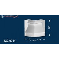 Weitere Ergänzungselemente sind die unterschiedlichen Eckelemente. Mit dem äußeren Eckelement lässt sich die Fassadenstuck Gesimsleiste Kiel 142 als Umlaufgesims verwenden. Diese 90-Grad-Ecken brauchen Sie nur an den Hausecken anzukleben, dann die entsprechend langen Zierleisten dazwischen zu kleben und schon können Sie Ihren Erfolg bewundern. Wenn Sie die Gesimsprofile um einen Erker, Balkon oder Hausanbau herumführen möchten, brauchen Sie auch das innere Eckelement, das das Stuckmuster von der Hauswand zum Anbau hinführt.