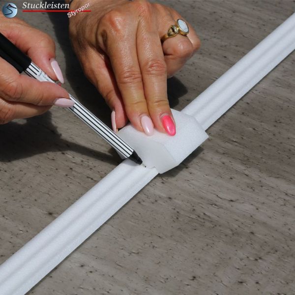 Messen Sie den Abstand zwischen den Eckelementen ab und bei Bedarf kürzen Sie die 2 Meter lange Stuckleiste. Bitte messen Sie lieber zweimal, als einmal zuwenig, bevor Sie die Stuckleisten zuschneiden. Zum Anzeichnen der Schnittlinie empfehlen wir Ihnen die Markierschablone auf die Leiste zu legen und dann z.B. mit einem Filzstift die Schnittlinie zu markieren, damit der Schnitt später gerade gelingt. Mit einem scharfen Cuttermesser können Sie die Stuckleiste neben der Markierschablone einfach und genau auf die gewünschte Länge zuschneiden.