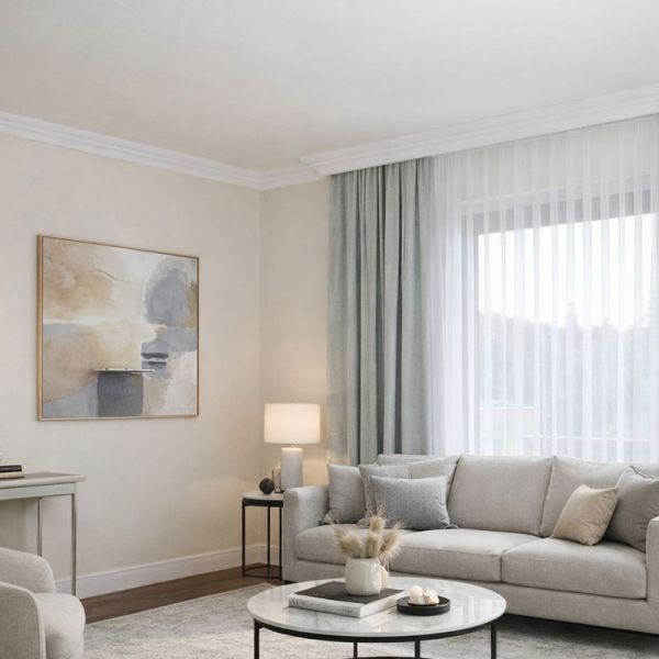 Vor der Gardinenleiste kann nur eine Klebefläche (an der Decke) genutzt werden, deswegen haben wir unsere Vorhangleisten entwickelt. Die obere Klebefläche der Vorhangleiste haben wir vergrößert, die sich dann zum Einbau vor den Gardinenschienen eignet. Zu den Vorhangleisten fertigen wir innere und äußere Eckelemente, die Sie als Weiterführung der Deckenleisten einbauen können, wie auf den Bildern gezeigt ist. Die Größe und das Stuckmuster der Eckleiste und der gleichnamigen Vorhangleiste sowie der Ergänzungselemente sind identisch, auf diese Weise kann eine einheitliche und ästhetische Stuckverzierung gestaltet werden.