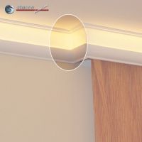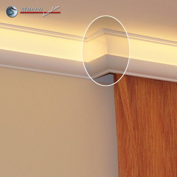 Das Innere der Stuckleiste ist hohl. Im oberen Teil ist die Zierleiste konkav gearbeitet, so dass das Licht optimal in den Raum reflektiert wird, ohne die geheimnisvolle Lichtquelle zu verraten. Die Lichtquelle selbst ist im unteren Teil der Stuckleiste verborgen eingebaut. Dafür wurden in den unteren Teil - von außen vollkommen unsichtbar - 2 Nuten eingearbeitet: Die L-förmige Nut ist für die LED Strips und die U-förmige Nut daneben nimmt das Kabel auf, dass Sie für die Parallelschaltung neben den LED Strips weiterführen müssen.