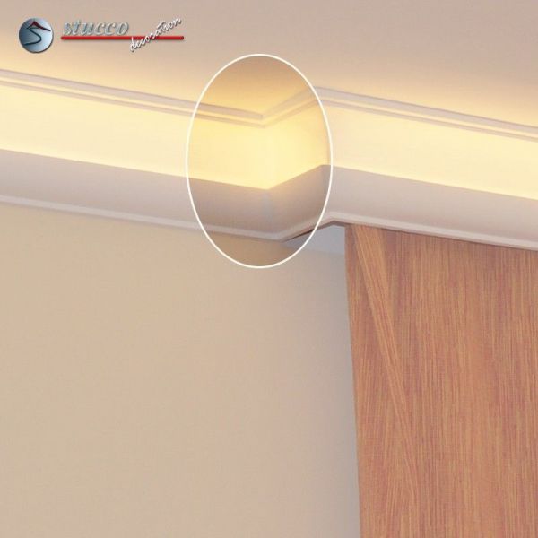 Planen Sie gerade die Wohnzimmer Beleuchtung oder die Bürobeleuchtung mit Stuck und LEDs? Alles ist mit den Lichtleiste für die direkte und indirekte Deckenbeleuchtung, LED Spots und LED Stripes möglich! In den unteren Teil der Kombi Lichtleisten für direkte und indirekte Beleuchtung können Sie LED Spots, seitlich LED Stripes einbauen. Die U-Profile und L-Profile unserer Styroporleisten für kombinierte Beleuchtung LED haben eine Länge von 100 cm.