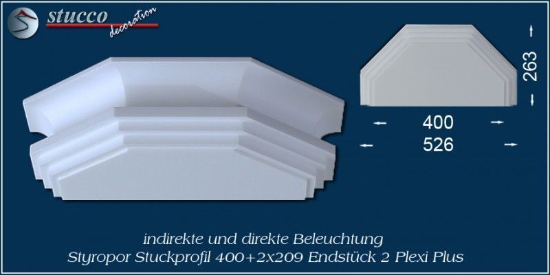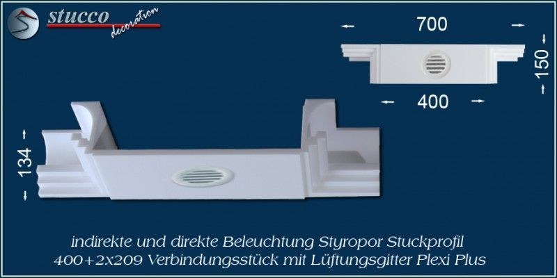 Dieses L-förmige Stuckprofil für kombinierte Beleuchtung besteht aus einer 40 cm breiten Grundplatte, an die auf einer Längsseite das Stuckprofil Dortmund 209 angefügt ist. So entsteht die L-Form, die für den Übergang von der Wand zur Decke ist. In die Grundplatte können Sie ein- oder zweireihig LED Spotlights mit Einbaurahmen Ihrer Wahl einbauen, in die seitliche Zierleiste LED Strips oder RGB Strips. Mit dem Einbau der LED Reflektorleisten optimieren Sie Ihre indirekte Beleuchtung, denn Sie verdoppeln die Lichtstärke der LED Streifen, kühlen die LEDs und verhindern das Durchscheinen des Lichts durch die Styroporleiste.
