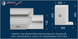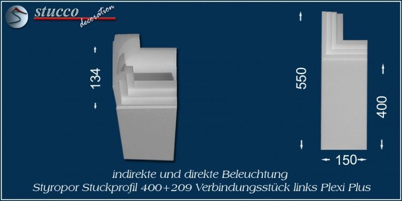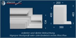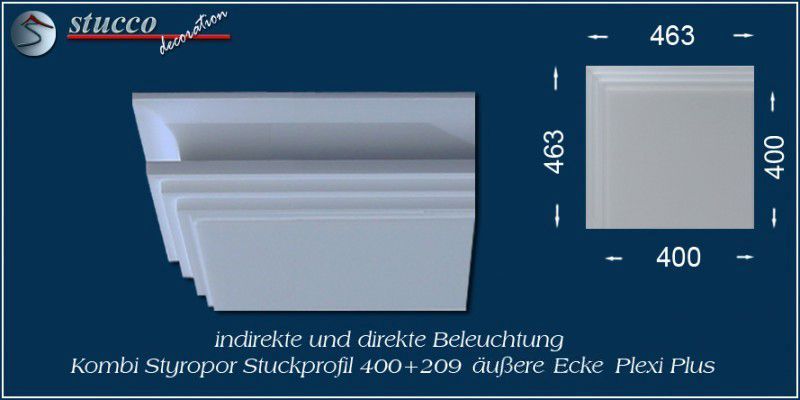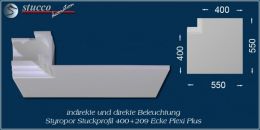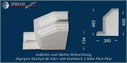 Dieses L-förmige Stuckprofil für kombinierte Beleuchtung besteht aus einer 40 cm breiten Grundplatte, an die auf einer Längsseite das Stuckprofil Dortmund 209 angefügt ist. So entsteht die L-Form, die für den Übergang von der Wand zur Decke ist. In die Grundplatte können Sie ein- oder zweireihig LED Spotlights mit Einbaurahmen Ihrer Wahl einbauen, in die seitliche Zierleiste LED Strips oder RGB Strips. Mit dem Einbau der LED Reflektorleisten optimieren Sie Ihre indirekte Beleuchtung, denn Sie verdoppeln die Lichtstärke der LED Streifen, kühlen die LEDs und verhindern das Durchscheinen des Lichts durch die Styroporleiste.