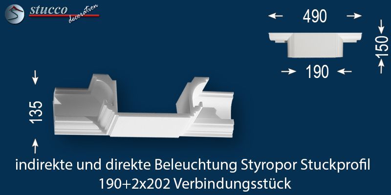 Die Lichtleiste Essen 190+2x202 ist ein U-förmiges Stuckprofil für die direkte und indirekte Beleuchtung. Die Artikelnummer 190+2x202 weist darauf hin, dass die Lichtleiste über eine Innenbreite von 190 mm verfügt und an den beiden Seiten des Kombi Stuckprofils die Stuckleiste Essen 202 montiert ist. Besonders geeignet ist die Lichtleiste Essen 190+2x202 zur LED Badbeleuchtung und Bürobeleuchtung.