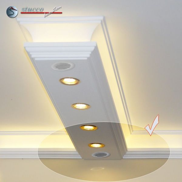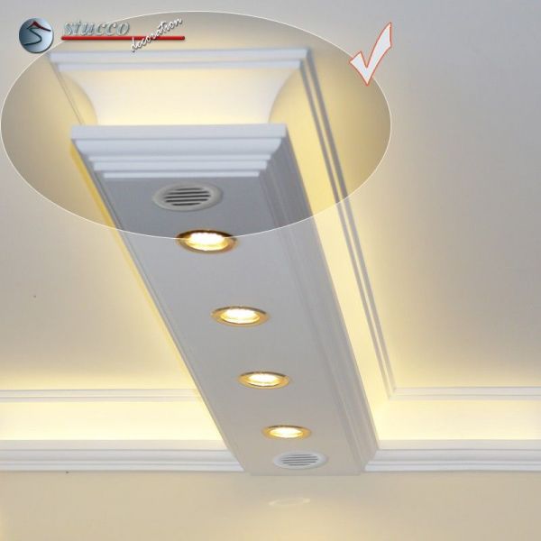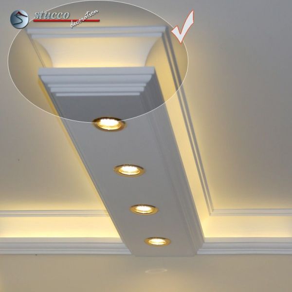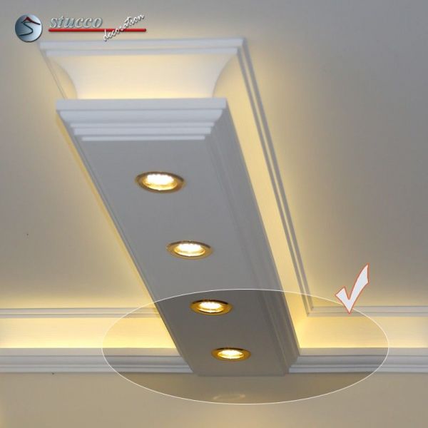 Bitte beachten Sie, dass sowohl die indirekte Beleuchtung als auch die direkte Beleuchtung vom qualifizierten Fachpersonal montiert werden soll. Nur LED Strips und LED Spotlampen sind wegen der geringen Wärmeerzeugung geignet, in Styropor Stuckleisten eingebaut zu werden. Halogen Leuchtmittel sind dafür leider NICHT geeignet!