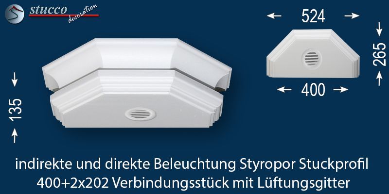 Diese Stuckleiste für kombinierte Beleuchtung besteht aus einer 40 cm breiten Grundplatte, an die auf beiden Längsseiten das Stuckprofil Essen 202 angefügt ist. In die Grundplatte können Sie ein- oder zweireihig LED Spots mit Einbaurahmen Ihrer Wahl einbauen, in die seitliche Zierleiste LED Strips oder RGB Strips. Mit dem Einbau der LED Reflektorleisten optimieren Sie Ihre indirekte Beleuchtung, denn Sie verdoppeln die Lichtstärke der LED Streifen, kühlen die LEDs und verhindern das Durchscheinen des Lichts durch die Styroporleiste.