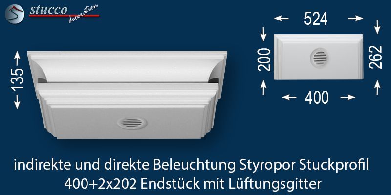 Die Lichtleiste Essen 400+2x202 ist ein U-förmiges Stuckprofil für die direkte und indirekte Beleuchtung. Die Artikelnummer 400+2x202 weist darauf hin, dass die Lichtleiste über eine Innenbreite von 400 mm verfügt und an beiden Seiten des Kombi Stuckprofils die Stuckleiste Essen 202 montiert ist. Besonders geeignet ist die Lichtleiste Essen 400+2x202 zur LED Beleuchtung in der Küche (z.B: Beleuchtung der Frühstückstheke) und zur Bürobeleuchtung.