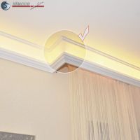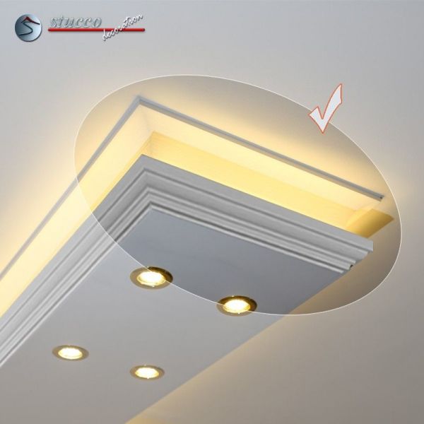 Unsere Stuckleisten in dieser Kategorie wurden speziell zum Ausbau der indirekten Beleuchtung entwickelt. Wie auf dem Bild zu sehen ist, sind im Inneren der Stuckleisten für die indirekte Beleuchtung zwei Nuten vorhanden. In der oberen Nut verlegen Sie die Reflektrostreifen sowie die LED Strips. In der unteren Nut verstecken Sie die Kabel, die die LED Strips mit Strom versorgen. So brauchen Sie sich keine Gedanken zu machen, wo und wie Sie die Kabel verstecken können.