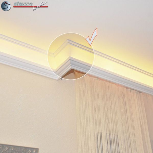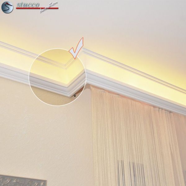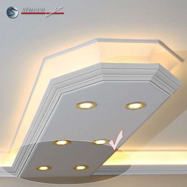 Bitte beachten Sie, dass sowohl die indirekte Beleuchtung als auch die direkte Beleuchtung vom qualifizierten Fachpersonal montiert werden soll. Nur LED Strips und LED Spotlampen sind wegen der geringen Wärmeerzeugung geignet, in Styropor Stuckleisten eingebaut zu werden. Halogen Leuchtmittel sind dafür leider NICHT geeignet!