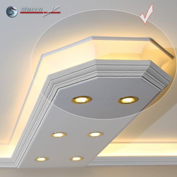 Ihre Vorteile durch das neue Stuckprofil Essen 400+2x202 für die direkte und indirekte Deckenbeleuchtung mit LED Einbauleuchten und LED Stripes