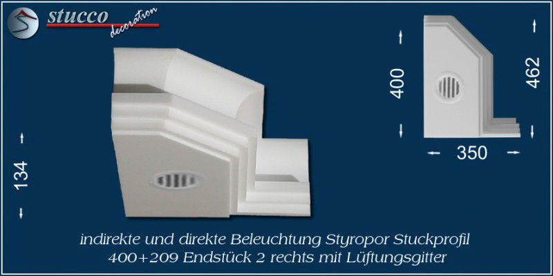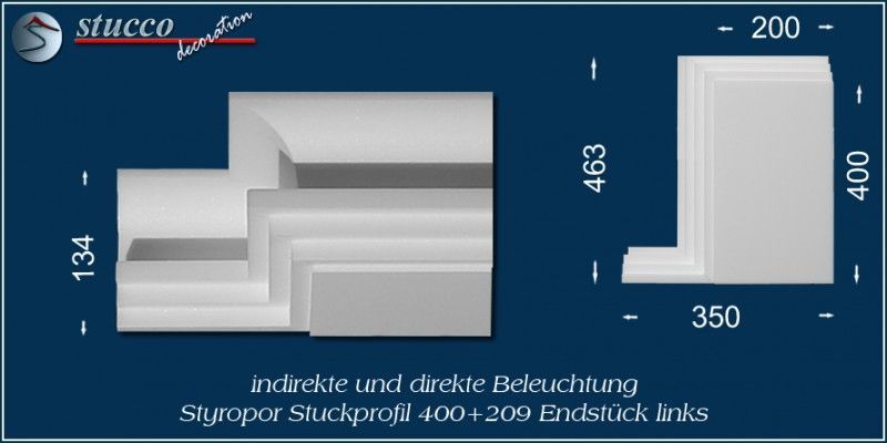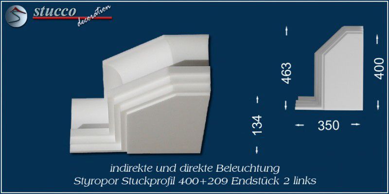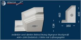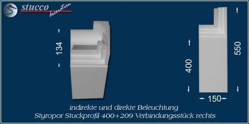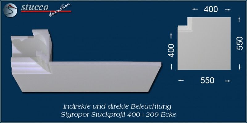 Dieses L-förmige Stuckprofil für kombinierte Beleuchtung besteht aus einer 40 cm breiten Grundplatte, an die auf einer Längsseite das Stuckprofil Dortmund 209 angefügt ist. So entsteht die L-Form, die für den Übergang von der Wand zur Decke ist. In die Grundplatte können Sie ein- oder zweireihig LED Spotlights mit Einbaurahmen Ihrer Wahl einbauen, in die seitliche Zierleiste LED Strips oder RGB Strips. Mit dem Einbau der LED Reflektorleisten optimieren Sie Ihre indirekte Beleuchtung, denn Sie verdoppeln die Lichtstärke der LED Streifen, kühlen die LEDs und verhindern das Durchscheinen des Lichts durch die Styroporleiste.