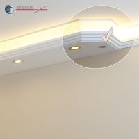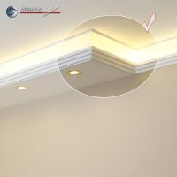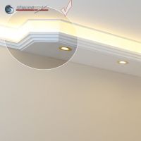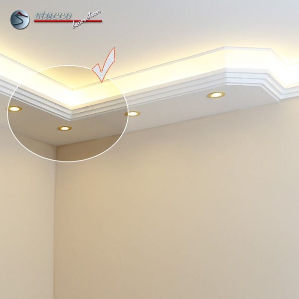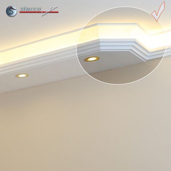 Planen Sie gerade die Wohnzimmer Beleuchtung oder die Bürobeleuchtung mit Stuck und LEDs? Alles ist mit den Lichtleiste für die direkte und indirekte Deckenbeleuchtung, LED Spots und LED Stripes möglich! In den unteren Teil der Kombi Lichtleisten für direkte und indirekte Beleuchtung können Sie LED Spots, seitlich LED Stripes einbauen. Die U-Profile und L-Profile unserer Styroporleisten für kombinierte Beleuchtung LED haben eine Länge von 100 cm.