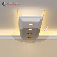 Unsere Stuckleisten in dieser Kategorie wurden speziell zum Ausbau der indirekten Beleuchtung entwickelt. Wie auf dem Bild zu sehen ist, sind im Inneren der Stuckleisten für die indirekte Beleuchtung zwei Nuten vorhanden. In der oberen Nut verlegen Sie die Reflektorstreifen sowie die LED Strips. In der unteren Nut verstecken Sie die Kabel, die die LED Strips mit Strom versorgen. So brauchen Sie sich keine Gedanken zu machen, wo und wie Sie die Kabel verstecken können.