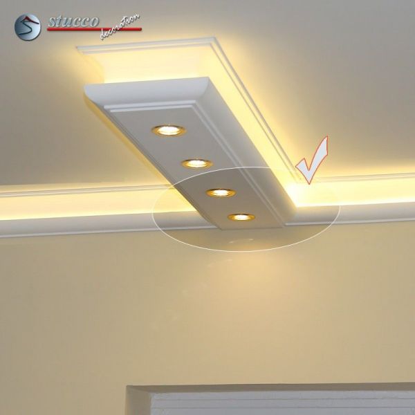 Planen Sie gerade die Wohnzimmer Beleuchtung oder die Bürobeleuchtung mit Stuck und LEDs? Alles ist mit den Lichtleiste für die direkte und indirekte Deckenbeleuchtung, LED Spots und LED Stripes möglich! In den unteren Teil der Kombi Lichtleisten für direkte und indirekte Beleuchtung können Sie LED Spots, seitlich LED Stripes einbauen. Die U-Profile und L-Profile unserer Styroporleisten für kombinierte Beleuchtung LED haben eine Länge von 100 cm.