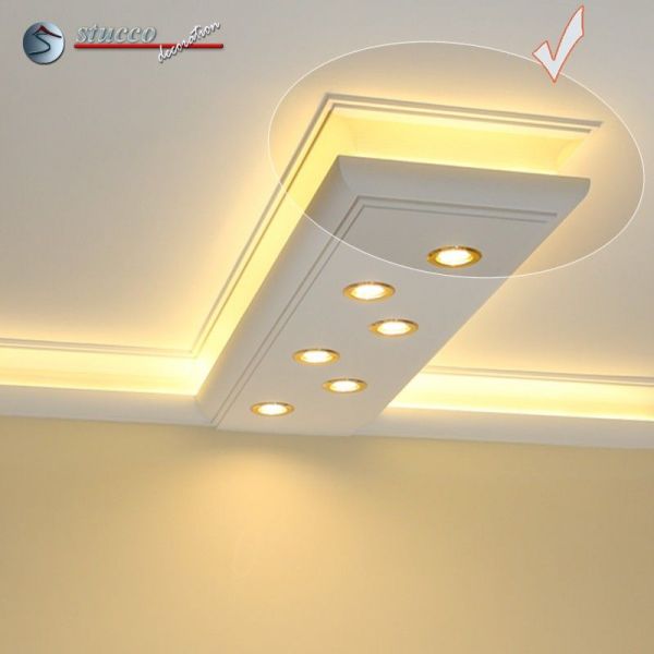Planen Sie gerade die Wohnzimmer Beleuchtung oder die Bürobeleuchtung mit Stuck und LEDs? Alles ist mit den Lichtleiste für die direkte und indirekte Deckenbeleuchtung, LED Spots und LED Stripes möglich! In den unteren Teil der Kombi Lichtleisten für direkte und indirekte Beleuchtung können Sie LED Spots, seitlich LED Stripes einbauen. Die U-Profile und L-Profile unserer Styroporleisten für kombinierte Beleuchtung LED haben eine Länge von 100 cm.