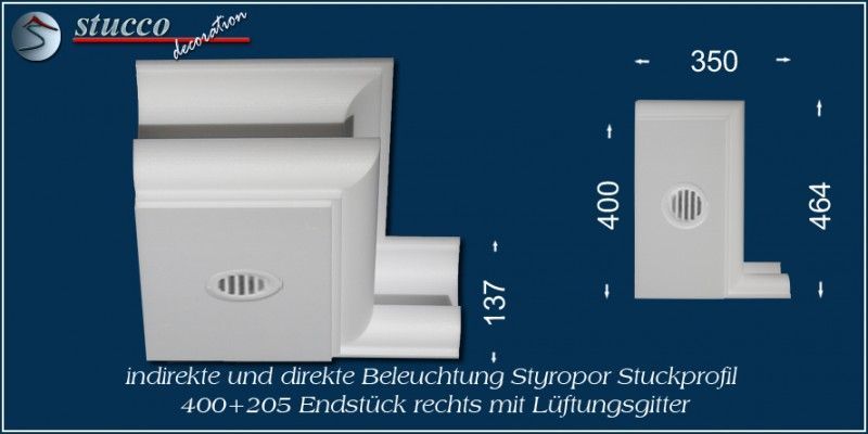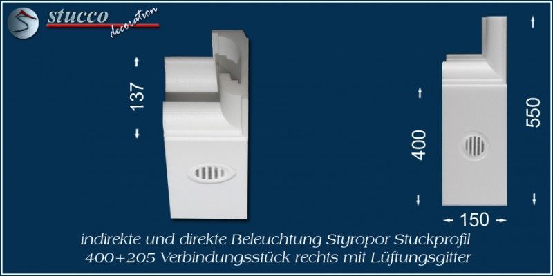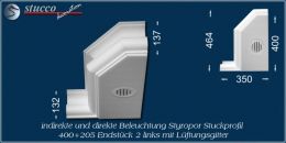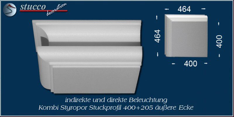 Dieses L-förmige Stuckprofil für Kombi Beleuchtung besteht aus einer 40 cm breiten Grundplatte, an die auf einer Längsseite das Stuckprofil München 205 angefügt ist. So entsteht die L-Form, die für den Übergang von der Wand zur Decke ist. In die Grundplatte können Sie ein- oder zweireihig LED Spotlights mit Einbaurahmen Ihrer Wahl einbauen, in die seitliche Zierleiste LED Strips oder RGB Strips. Mit dem Einbau der LED Reflektorleisten optimieren Sie Ihre indirekte Beleuchtung, denn Sie verdoppeln die Lichtstärke der LED Streifen, kühlen die LEDs und verhindern das Durchscheinen des Lichts durch die Styroporleiste.