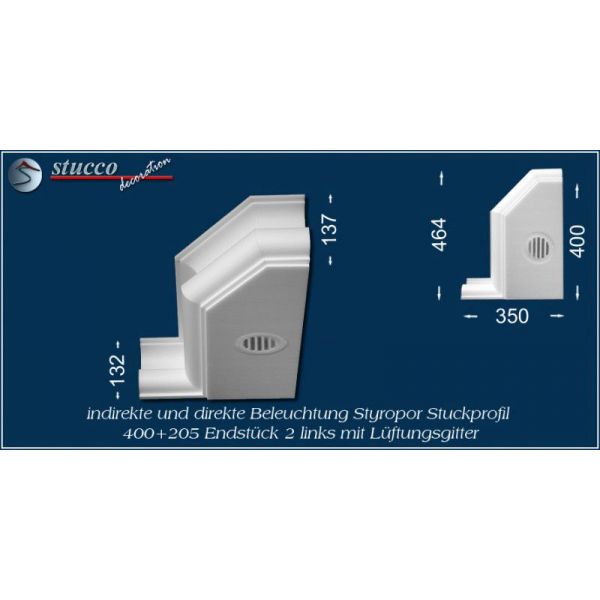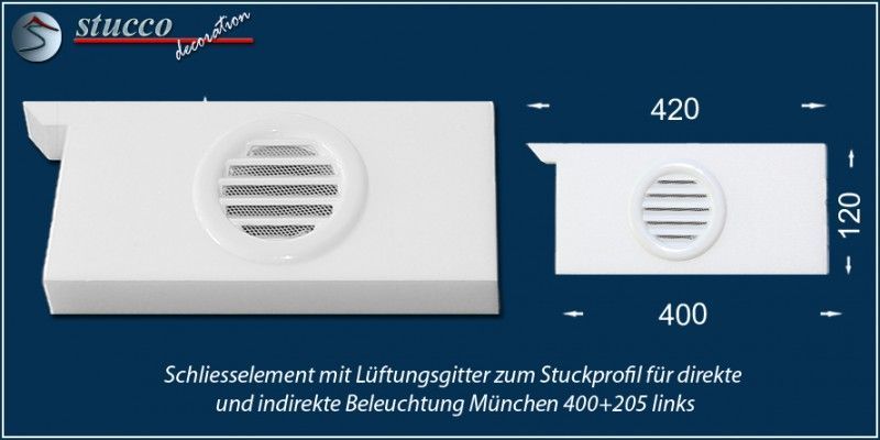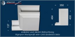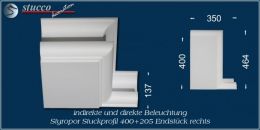 Die Lichtleiste München 400+2x205 ist ein U-förmiges Stuckprofil für die direkte und indirekte Beleuchtung. Die Artikelnummer 400+2x205 weist darauf hin, dass die Lichtleiste über eine Innenbreite von 400 mm verfügt und an beiden Seiten des Kombi Stuckprofils die Stuckleiste München 205 montiert ist. Besonders geeignet ist die Lichtleiste München 400+2x205 zur LED Beleuchtung in der Küche (z.B: Beleuchtung der Frühstückstheke) und zur Bürobeleuchtung.