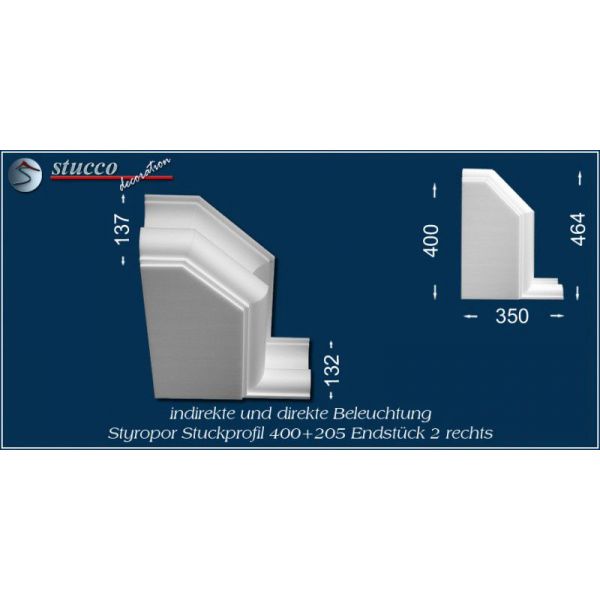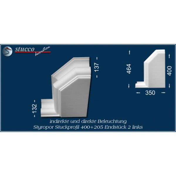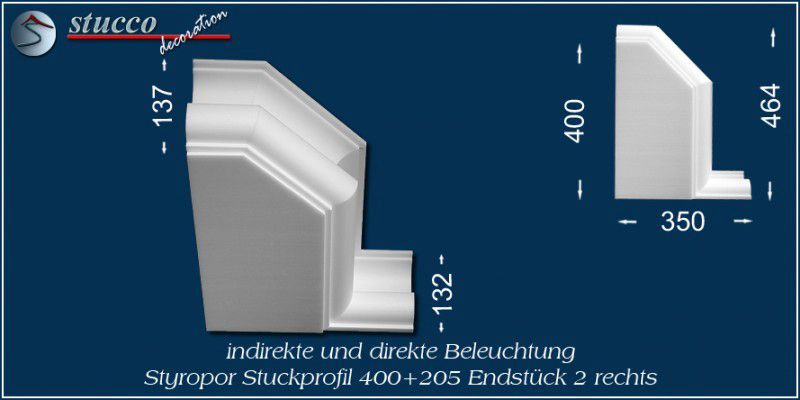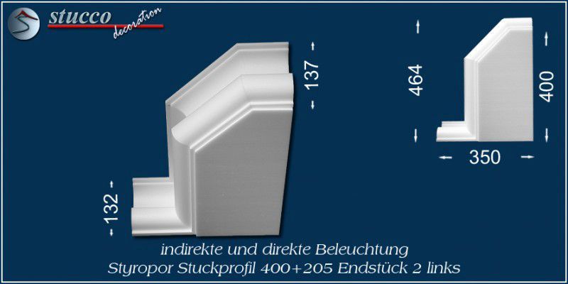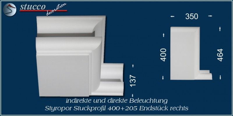Die Lichtleiste München 400+205 ist ein L-förmiges Stuckprofil für die direkte und indirekte Beleuchtung. Die Artikelnummer 400+205 weist darauf hin, dass die Lichtleiste über eine Innenbreite von 400 mm verfügt und an eine Seite des Kombi Stuckprofils die Stuckleiste München 205 montiert ist. Besonders geeignet ist die Lichtleiste München 400+205 zur LED Beleuchtung in der Küche (z.B: Beleuchtung der Frühstückstheke) und zur Bürobeleuchtug.