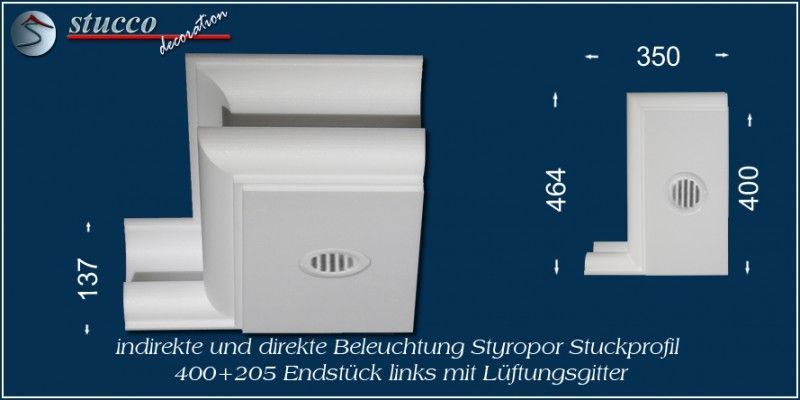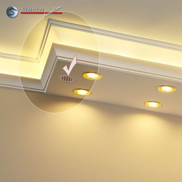 LEDs erzeugen kaum Wärme. Dennoch empfehlen wir Ihnen unsere Ergänzungselemente mit Lüftungsgitter zu verwenden, wenn Sie Trafo / Netzteil und Controller in die Stuckleisten für die LED Beleuchtung einbauen. So ist die Belüftung auch gesichert. Als Ergänzungselement mit Lüftungsgitter zu den Stuckleisten für die LED Beleuchtung bieten wir Schließelemente, Verbindungsstücke sowie Endstücke an. Die Ergänzungselemente mit Lüftungsgitter finden Sie immer auf der jeweiligen Artikelseite der Stuckleiste für die LED Beleuchtung.