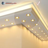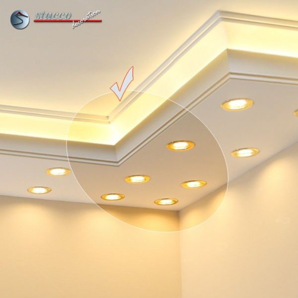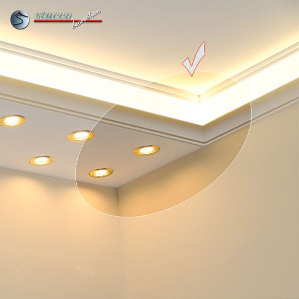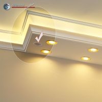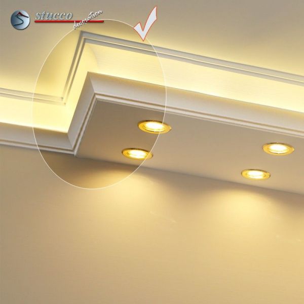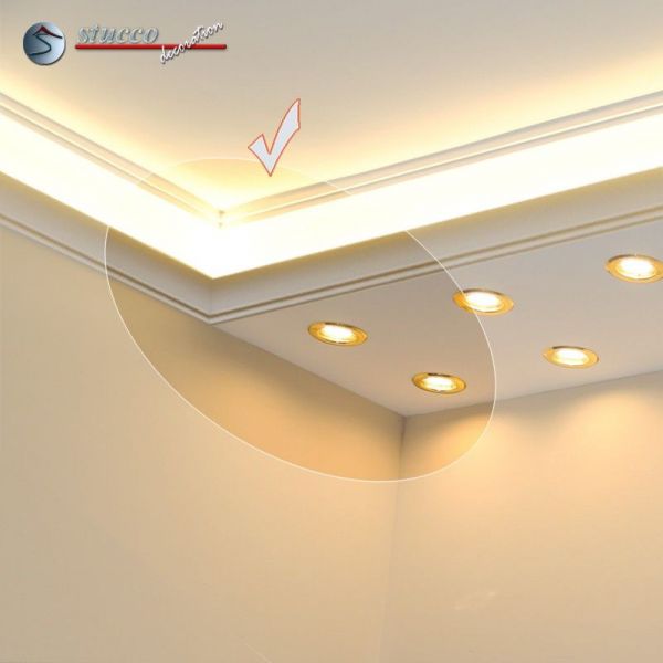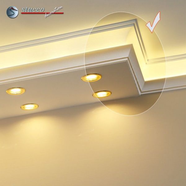 Planen Sie gerade die Wohnzimmer Beleuchtung oder die Bürobeleuchtung mit Stuck und LEDs? Alles ist mit den Lichtleiste für die direkte und indirekte Deckenbeleuchtung, LED Spots und LED Stripes möglich! In den unteren Teil der Kombi Lichtleisten für direkte und indirekte Beleuchtung können Sie LED Spots, seitlich LED Stripes einbauen. Die U-Profile und L-Profile unserer Styroporleisten für kombinierte Beleuchtung LED haben eine Länge von 100 cm.