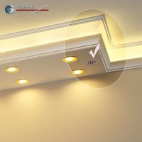 In den unteren Teil der Kombi Lichtleisten für die direkte und indirekte Deckenbeleuchtung können LED Spots einfach und schnell eingebaut werden. Sollten Sie auf die direkte Beleuchtung verzichten, können Sie im Inneren der Kombi Lichtleiste die Netzteile, Kabel, Vertärker sowie den Controller verstecken.