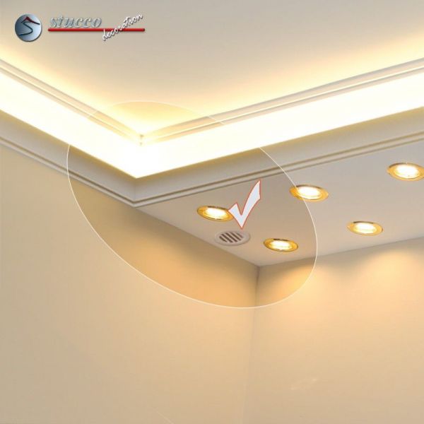 Bitte überzeugen Sie sich selbst davon, wie viele gut durchdachte und gut planbare Möglichkeiten diese Stuckleisten bieten. Es wird Ihre Fantasie bestimmt beflügeln, wenn Sie auch die Details dieser herrlichen Produkte kennen. Unsere vorgefertigten Stuckleisten-Elemente garantieren Ihnen einen einfachen und schnellen Einbau, unabhängig davon, ob Sie sich LED Spots oder LED Strips wünschen.Stellen Sie sich einmal vor, was für Möglichkeiten sich bieten: Nur einmal bauen und Sie erhalten neben einem wunderschönen, mit modernen Stuckleisten verzierten Zimmer auch eine angenehme, indirekte Beleuchtung mit LED Strips begleitet von einer direkten Beleuchtung mit LED Einbaustrahlern.