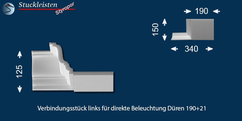 Rechtes und linkes Verbindungsstück: Falls eine Wandseite im Raum mit der klassischen Deckenleiste Düren 21 und die anschließende Wandseite mit dem Stuckprofil für direkte Beleuchtung Düren 190+21 verziert wird, dann sind die Verbindungsstücke ideal, um die beiden Stuckleisten in den Zimmerecken miteinander zu verbinden. An den einen Schenkel des Verbindungsstücks lässt sich die Zierleiste Düren 21 anfügen, an den anderen Schenkel das Stuckprofil Düren 190+21.