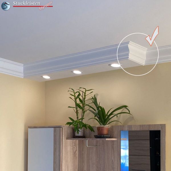 Bei der Innenraumgestaltung werden meistens alle Wände eines Raumes mit der gleichen Stuckleiste verziert. Die Stuckleiste wird in die Hohlkehle zwischen Wand und Decke geklebt, hat also zwei Klebeflächen: eine an der Wand, die andere an der Decke. Doch wie soll man verfahren, wenn man eine Gardinenstange mit der Stuckleiste verkleiden möchte? Bei den Fenstern steht meist nur die Klebefläche an der Decke zur Verfügung. Aus diesem Grund bieten wir passend zur Stuckleiste Düren 21 die Vorhangleiste Düren 21 an. Die Vorhangleiste zur Stuckleiste Düren 21 verfügt über eine breitere obere Klebefläche. So kann die Profilleiste trotz nur einer zur Verfügung stehenden Klebefläche stabil fixiert werden. Natürlich sind Innen- und Außenecken auch zur Vorhangleiste als vorgefertigte Stuckelemente erhältlich.
