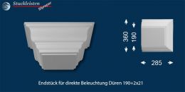 Endstück: Mit diesen Endstücken können Sie das U-förmige Stuckprofil für direkte Beleuchtung Düren 190+2x21 formschön und ästhetisch abschließen. Überlassen Sie die komplizierten Gehrungsschnitte uns und ersparen Sie sich auch mit der Verwendung des Endstücks zeitraubende Bastelei. Das Endstück brauchen Sie nur einfach mit Styroporkleber an das Stuckprofil anzufügen – fertig!