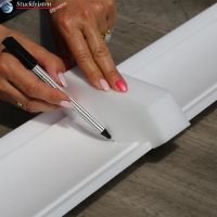 Jetzt wird der überschüssige Kleber entfernt, der beim Andrücken der Stuckelemente aus den Stoßfugen herausgequollen ist. Hierzu eignet sich entweder ein Spachtel oder - noch einfacher - unsere Negativform, die wir für jede Stuckleiste anbieten. Das Negativprofil hat den Vorteil, dass Sie mit einer Handbewegung den Kleber entfernen und gleichzeitig das Stuckmuster über die gesamte Leistenbreite nachformen.