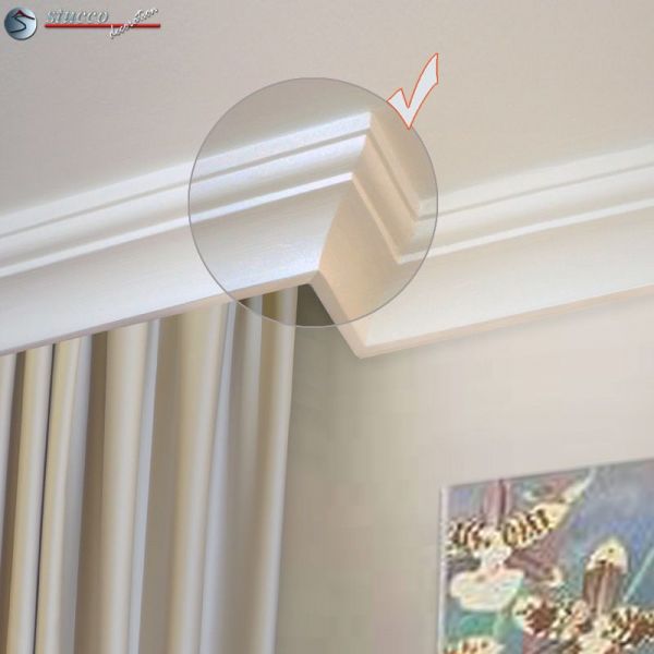 Die klassischen Stuckprofile und Eckelemente aus Styropor werden bei den Stuckarbeiten in die Schnittlinie zwischen Wand und Decke geklebt. Das bedeutet, dass diese Styroporleisten mit Hilfe von zwei Klebeflächen fixiert werden. Die untere Klebefläche wird an der Wand, die obere Klebefläche an der Decke befestigt. Zum Verbergen der Gardinenschiene können die Leisten nur an der Zimmerdecke befestigt werden. Die schmale Klebefläche reicht dafür nicht aus. Aus diesem Grund bieten wir zu den Styroporleisten Amsterdam 15 passende Vorhangleisten und Vorhangleisten Eckelemente aus Styropor an.