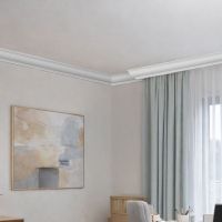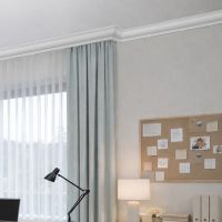 Vor der Gardinenleiste kann nur eine Klebefläche (an der Decke) genutzt werden, deswegen haben wir unsere Vorhangleisten entwickelt. Die obere Klebefläche der Vorhangleiste haben wir vergrößert, die sich dann zum Einbau vor den Gardinenschienen eignet. Zu den Vorhangleisten fertigen wir innere und äußere Eckelemente, die Sie als Weiterführung der Deckenleisten einbauen können, wie auf den Bildern gezeigt ist. Die Größe und das Stuckmuster der Eckleiste und der gleichnamigen Vorhangleiste sowie der Ergänzungselemente sind identisch, auf diese Weise kann eine einheitliche und ästhetische Stuckverzierung gestaltet werden.