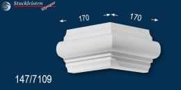 Zu den Ergänzungselementen gehören die verschiedenen Eckelemente. Mit dem äußeren Eckelement lässt sich die Fassadenstuck Zierleiste Lübeck 147 als Umlaufgesims verwenden. Diese 90-Grad-Ecken brauchen Sie nur an den Hausecken anzukleben, dann die entsprechend langen Zierleisten dazwischen zu kleben und schon können Sie Ihren Erfolg bewundern. Wenn Sie die Gesimsprofile um einen Erker, Balkon oder Hausanbau herumführen möchten, brauchen Sie auch das innere Eckelement, das das Stuckmuster von der Hauswand zum Anbau hinführt.
