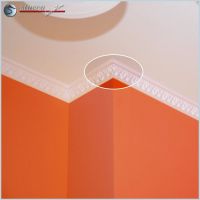 Zum Abschluß müssen die Fugen zwischen der Stuckleiste und der Decke sowie die Fugen zwischen der Wand und der Stuckleiste geschlossen werden. Dies geht einfach, indem etwas Kleber mit Hilfe der Kartuschenpresse auf die Fugen aufgebracht wird. Der Kleber lässt sich mit einem nassen Schwamm oder der angefeuchteten Fingerspitze glätten und verteilen. Wenn alle Stuckarbeiten abgeschlossen sind, brauchen Sie den Styroporstuck nur noch mit einer umweltfreundlichen Farbe auf Wasserbasis (sogenannter Dispersionsfarbe) zu streichen. Dadurch erhalten die Zierleisten und die Stöße ein einheitliches Aussehen und Ihr Stuck aus Styropor wirkt wie aus einem Guss.